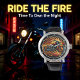 Vivid artwork of a motorcycle surrounded by lively orange flames, symbolizing speed, freedom, and power. Bright colors and abstract elements emphasize its energetic and bold concept.