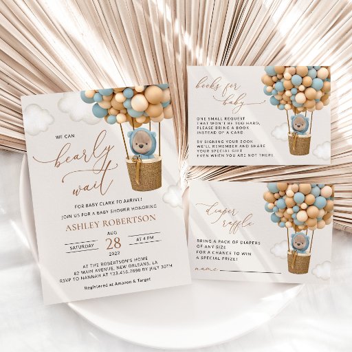 Ajoutez une touche personnelle à votre fête de baby shower avec ces objets de fête élégants et mémorables ! Design avec ours bébé avec ballons bleus sur arrière - plan beige.