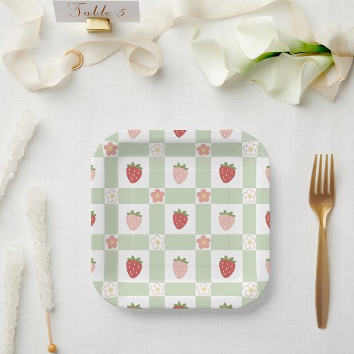 Assiettes En Carton Paper Plate Cute Strawberry Gingham Pastel Green