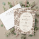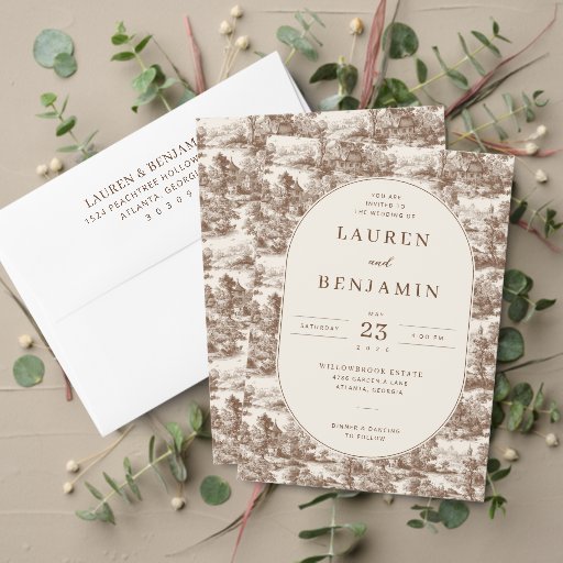 This is a vintage style image featuring an elegant wedding invitation design with intricate sepia-toned illustrations of quaint cottages and lush trees in the background. The central circle showcases the names "Lauren and Benjamin" along with their special date, May 23, 2026, all set against a soft, neutral backdrop. It exudes a timeless charm and romantic sophistication, perfect for couples who appreciate classic aesthetics. This design would beautifully complement a rustic or countryside wedding theme.