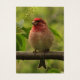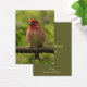 Cette carte de commerce d'artiste présente un beau pinceau violet assis en haut d'une branche, entouré de feuilles verts. Il a une tête rouge brillante et une poitrine rose pâle. Son bec robuste est parfait pour craquer les graines. C'est l'oiseau que le célèbre ornithologue Roger Tory Peterson décrit comme un "moineau trempé dans le jus de framboise".
