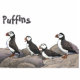 Puffins rust op de stenen. tekst lezen, ook "Puffins". De Atlantische Puffin (Fratercula arctica) voedt zich voornamelijk door in het water te duiken. Zij fokken zich in grote kolonies op kustkliffen of offshore-eilanden in de Noord-Atlantische Oceaan. Puffins gooien de kleurrijke buitenste delen van hun rekeningen af na het broedseizoen, waarbij een kleiner en duller snavel achterblijft. Hun korte vleugels zijn aangepast voor zwemmen met een vliegtechniek onder water. In de lucht sloegen ze hun vleugels snel (tot 400 keer per minuut) in een snelle vlucht, die vaak laag over het oppervlak van de oceaan vliegt.