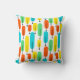 Deze gooiende kussen hebben een modern, modern design van lange ovalen in gele, oranje, groene en turquoise met zwarte lijnen met cirkels aan de uiteinden.