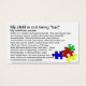 visitekaartje met wat basisinformatie over ASD "Autisme is een complexe neurologische aandoening...." "Deze driftbuien kunnen angstaanjagend zijn om te zien. Het kind probeert te communiceren......" Achterkant van kaart heeft afbeelding van vallende puzzelstukjes tegen een blauwe achtergrond met achtergrondverlichting. Deze kaarten kunnen handig zijn wanneer een ouder probeert het gedrag van het kind te beheren en gadgets verzamelen en/of commentaar geven.
