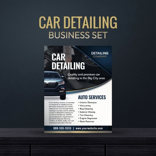 Promoot uw autodetailhandel met deze slanke en professionele flyer-sjabloon, ontworpen in een gedurfd marineblauw- en zilverkleurenschema. Deze volledig bewerkbare flyer is ideaal voor elk autodetailleringsbedrijf en stelt u in staat om elk aspect aan te passen aan uw merk - van de bedrijfsnaam en contactgegevens tot een gepersonaliseerde "Over ons"-alinea die uw expertise benadrukt. Laat uw volledige scala aan services zien, waaronder stofzuigen, shampooing in het interieur, waxen en meer. U kunt ook maximaal drie aanpasbare servicepakketten aanbieden, elk met bewerkbare prijzen en details die bij uw aanbod passen. Schoon, modern en impactvol, deze flyer is de perfecte marketingtool om de aandacht te trekken en nieuwe klanten binnen te halen.
