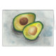 Waterverf schilderij van een verse groene avocado, in tweeën gesneden. Grijze en blauwe gevlekte achtergrond.