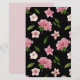Ce joli papier scrapbooking rose et noir présente un magnifique motif de fleurs roses. Il comprend des azalées, des pétunias et d'autres petites fleurs roses en forme d'étoile sur un arrière - plan noir. Il y a aussi des feuilles verts éparpillés tout autour. Ce joli papier à motif floral serait très adapté à presque n'importe quel projet d'artisanat de papier où un design floral élégant et coloré est nécessaire.