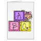 Een schattig babymeisje en drie alfabetblokken op Baby ABC-overhemden, mokken, kaarten, stickers, canvas tassen, lichaamspakken, postzegels en andere voorwerpen.