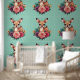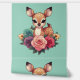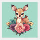 Een betoverende illustratie met een schattig baby hert omringd door bloeiende rozen van verschillende kleuren, die de levendige details van de bloemen en de charmante kenmerken van de fawn benadrukken.