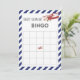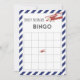 Baby shower bingo-kaart met vliegtuigontwerp en marinesblauwe strepen achtergrond.