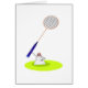 Cute cartoon illustratie van een badminton shuttlecock met een badminton racket klaar voor een game. Afbeelding beschikbaar op diverse giften en producten. Wenskaarten. Notitiekaarten.