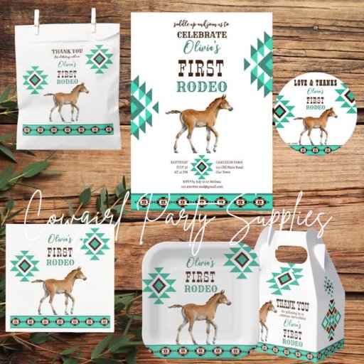 Premier rodéo turquoise folk motif sud-ouest pays petit cowboy cowboy bébé cheval foal western style fête d'anniversaire personnalisé merci faveurs boîte cadeau. Pour les garçons et pour les filles, les couleurs aqua et marron peuvent s'accorder à beaucoup de décors et autres choses.