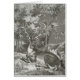 Een hert, staar, die op de grond ligt in een bos. , antiek illustratie.