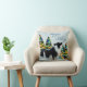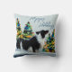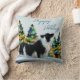 De Collie van de grens in de wintersneeuwkerstboomvakantie. Kalm wintersneeuwlandschap met een mooie zwarte en witte grenscollie en kleurrijke kerstbomen. prettige feestdagen in een trendy script. Vakantieskussen voor een eigenaar van een grenskolonie. U kunt de tekst wijzigen of wissen.