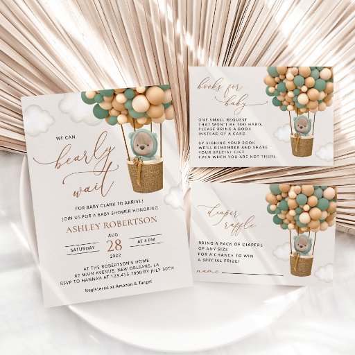 Ajoutez une touche personnelle à votre fête de baby shower avec ces objets de fête élégants et mémorables ! Design avec ours bébé avec ballons verts sur arrière - plan beige.