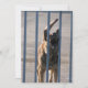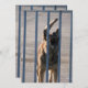 Guard hond blaft achter blauwe ijzeren repen. Fotografie.