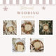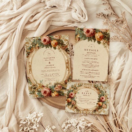 Een elegant vintage bruiloftsontwerp omlijst met barokke bloeit en weelderige rozen in zacht blos, perzik en goudkleurige tinten. De antiek perkamentachtergrond en schilderachtige details geven creëer een tijdloze en romantische sfeer, ideaal voor een sprookjesachtig feest.