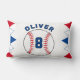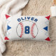 Honkbal Bunting Flags Kids Verjaardag Lumbar Kussen. Het ontwerp heeft honkbal- en bunting-vlaggen in rode, witte en blauwe kleuren. Voeg jouw naam en leeftijd toe.