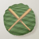 Ronde gooi kussen met afbeelding van een honkbal aan de voorkant en een honkbalveld en kruiste vleermuizen aan de achterkant.
