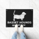 Basset Hounds hier gespoeld, schattig Basset Hound silhouette afbeelding en tekst in noodlijdende krijstijl op een zwarte achtergrond.