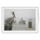 Un groupe de pélicans regardent dessus pendant qu'un bateau de crevette lui fait la sortie dans le brouillard.