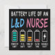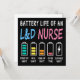 Humorous shift chart showing the battery life of an L&D nurse, also known as a labor and delivery nurse, with colorful levels from start to double shift. Ideal for maternity and birthing staff who enjoy relatable workplace humor.