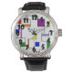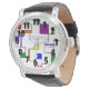 Dit mannen horloge heeft een Bauhaus-ontwerp van lijnen die verticaal en horizontaal lopen om een raster te maken met vierkanten, rechthoeken, driehoeken en cirkels die rond het raster zijn geplaatst. Als je het ontwerp leuk vindt, maar liever verschillende kleuren hebt, stuur me dan een bericht.