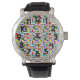 Dit mannen horloge heeft een Bauhaus-ontwerp van vierkanten en rechthoeken in rood, groen, blauw, oranje, lichtblauw, geel en rood.