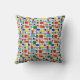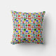 Dit kussen heeft een Bauhaus-ontwerp van een raster met vierkanten en rechthoeken in rood, groen, blauw, sinaasappel, lichtblauw, geel en rood.