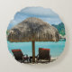 Rondwerpkussens met een ontdooide parasol en twee zonnige stoelen op een wit zandstrand in een luxe bungalow-toevluchtsoord in de heldere blauwe lagune van het eiland Bora Bora, vlakbij Tahiti in Frans-Polynesië.