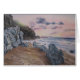 Waterverf schilderij van een eenzaam strand bij zonsondergang. Mooie warme kleuren en een kalmerend zee, met rotsen in de voorgrond.