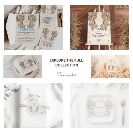Teddy Bear thème Twin boys Baby shower carte de remerciements, avec les ours les plus doux qui s'envolent haut avec de mignons montgolfières! Ce design est parfait pour célébrer l'arrivée des jumeaux. De mignons nounours aux arcs bleus tiennent des ballons bleus et beiges. 💙 💙 N'oubliez pas d'explorer la collection complète !