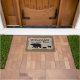 Dit is een schattige deurmat die perfect is voor een hut of een bos thuis. Hij heeft een faux-houtkorrelbanner met een zwart beer en twee cubs. De tekst boven de afbeeldingen van het beer luidt "Welkom in onze Den Haag". De banner wordt geplaatst op een stevige middelgrote bruine achtergrond.