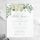 Een elegante florale bridale doucheuitnodiging met waterverf rozen en eucalyptusbladeren met moderne handgeschreven kalligrafie.