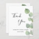 Hartelijk dank voor een Vrijgezellenfeest. Een witte chic-achtergrond versierd met eucalyptusgroen. Op voorkant groot zwart gekleurd handgeschreven manuscript en de tekst: Dank u, uw en een datum. Terug: Personaliseer en voeg Uw dank toe u nota en naam.