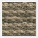 Rimpelpatroon in haakwerk, heeft een donkere band in de buurt van het midden die is omlijnd met tinten van geelbruine strepen, een lichte streep eronder en een gemiddelde tint aan de boven- en onderkant. Kleureffect ontstaat door het filteren van het originele afbeelding groen-wit met een sepia filter.
