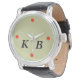 Een retro-blik met vier rode stippen, die driedimensionaal kijken, op de 12, 3, 6, en 9 posities. In het lagere centrum van gezicht, personaliseer met twee initialen die dalingsschaduwen zullen hebben. Pas/geef de achtergrondkleur aan uw het houden van uit.