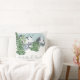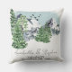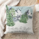 Dit schilderachtig aangepaste kussen beschikt over een winterberglandschap. Mooie, besneeuwde rotsachtige bergen zijn in de verte afgebeeld, met een bos van pijnbomen op de voorgrond. Een zwerm vogels vliegt in de verte weg.