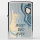 This Zippo lighter features the message “BEST DAD EVER” displayed in bold dark lettering over a marbled design in shades of blue, gray, beige, and yellow. The stone‑inspired pattern adds a refined, modern character to the iconic metal silhouette, creating a stylish and meaningful keepsake. Perfect for collectors, outdoor enthusiasts, or gifting as a thoughtful expression of appreciation for a truly special dad.