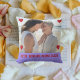 Modern, trendy accentkussen voor je bonusmoeder met een foto die je aan de voorkant kunt personaliseren, opgehouden koelkastmagneet-stijl uit de hoeken door vier harten, en de aanpasbare tekst "BEST BONUS MOM EVER!" Geweldig cadeau voor je stiefmoeder / pleegmoeder / tweede moeder op Moederdag of voor haar verjaardag. Merk op dat je dit fotokussen ook kunt personaliseren voor je favoriete tante, je oma, enz. Op een blauwe maagdenpalmachtergrond.