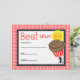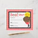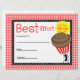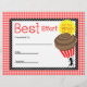 Een studentenbonuscertificaat voor de beste inspanning met een afbeelding van een mier met een grote chocolade cakaart met rood en wit papier en een prijs bovenaan. Achtergrond is rode gingham. Zwarte sierstrip met witte polka stippen.