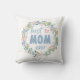 Een heerlijk Moederdag-kussen heeft een groen thema met een bloemenkransontwerp gemaakt van verschillende bladeren en waterverven tegen een effen achtergrond. De kleur op de achterkant van het kussen is zoet baby roze Het woord "MOM" is vet geschreven in het blauw met witte stippen en een grafisch roze hart. Koop vandaag nog jouw cadeaus van TheGiftsHub