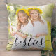 Beste vrienden foto-kussen, gepersonaliseerd met je namen. Het fotomalplaatje is opstelling voor u om uw eigen afbeeldingen toe te voegen - één van de voorzijde en één op de rug. De voorzijde heeft een elegante manuscriptbekleding die eenvoudig "bessen"leest terwijl de rug uw namen in vette typografie heeft. Dit ontwerp is beschikbaar met een witte bekleding of een zwarte bekleding zodat kunt u de kleur kiezen die het beste bij uw foto past.