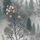 Deze fantastische scène behang beschikt over een donker, torenhoog kasteel met gloeiende ramen genesteld in een mistig bos van blauwe en grijze tinten. Omgeven door slanke groenblijvende bomen, kaal vertakte bomen en zacht bloesems in roze en sinaasappel, schittert het landschap met subtiele spikkels van magisch licht. De schemerige ambiance en etherische details creëer hebben een grillige, mysterieuze sfeer, ideaal voor liefhebbers van fantasie, sprookjes en droomachtige bosomgevingen.