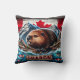 Een Canadese bever bouwt een dam in de buurt van een rivier omringd door bergen en bomen, met een Canadese vlag op de achtergrond.