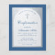 Een goedkope jongensbevestigingsuitnodiging. Op een klassiek blauwe rechthoekige achtergrond is er een namaak zilverfolie boog met daarin blauwe tekst op een witte achtergrond. Het woord Bevestiging en de naam zijn geschreven in een elegante kalligrafische letter; de eerste regel is gebogen tekst.