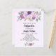Een violette, lavendelkleurige achtergrond. Versierd met violette en paarse waterkleurige bloemen en groen en een gouden kruis. Personaliseer en voeg jouw naam en ontvangstgegevens toe. 1 vel = 1 uitnodiging afgedrukt rand tot rand.