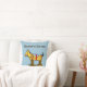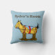 Een bewerkbaar werpkussen met jouw naam in westerne letters, en gerestaureerde kunst van een speelgoed met vlekjes op wieltjes, gerestaureerd uit een verhalenboek.