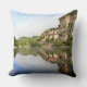 Gooi de kussens met het kasteel en het dorp Beynac-et-Cazenac op de kliffen aan de rand van de rivier de Dordogne in de vroege ochtend met reflectie in de rivier en een kajak in de voorgrond. De stad ligt in het Perigord in Frankrijk.