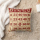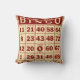 bingo kaart in rood en wit getoond op decoratieve kussen.